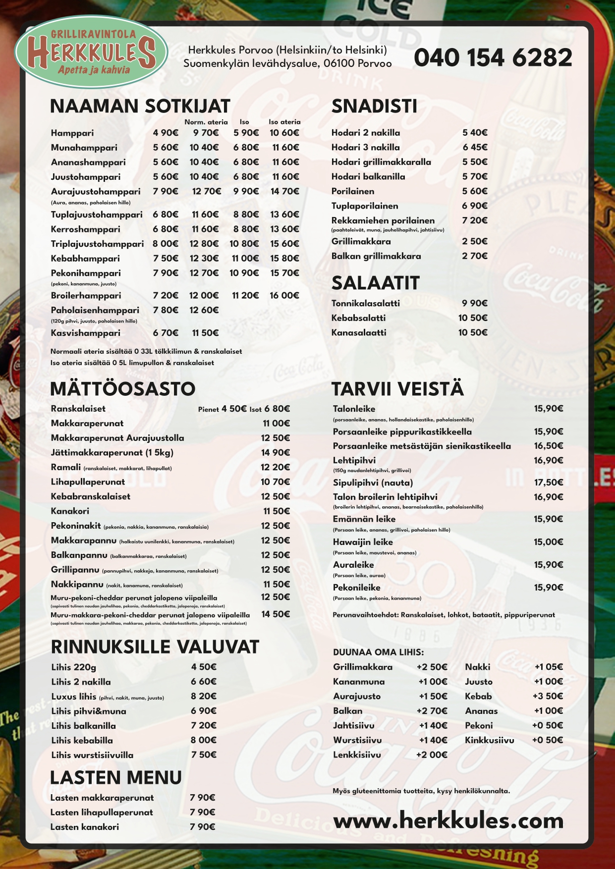 Herkkuleksen menu on täyttä tavaraa ilman turhaa kikkailua. Meillä burgerit on reiluja, hodarit kunnolla täytettyjä ja mättöannokset juuri sitä mitä nimi lupaa – isoa ruokaa isoon nälkään.